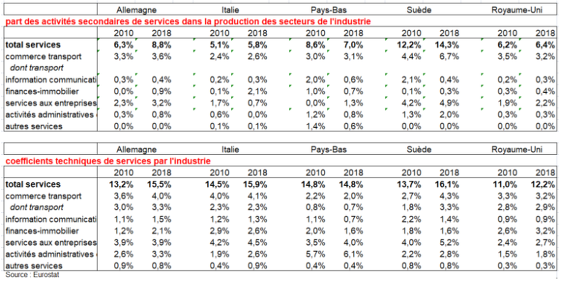 À partir des tableaux ressources-emplois d’Eurostat on estime la part des activité secondaires de services dans la production de secteurs de l’industrie et le coefficient technique de services par l’industrie (voir page Tableau entrées intermédiaires).