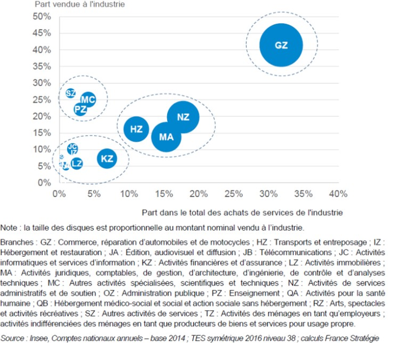 Selon ces estimations, 1,3 million d’emplois étaient engagés dans les services à l’industrie en 2016, principalement concentrés dans les branches « Commerce, réparation d’automobiles et de motocycles » (451 000), « Activités de services administratifs et de soutien » (319 000), « Activités juridiques, comptables, de gestion, d’architecture, d’ingénierie, de contrôle et d’analyses techniques » (131 000) et « Transports et entreposage » (+123 000).