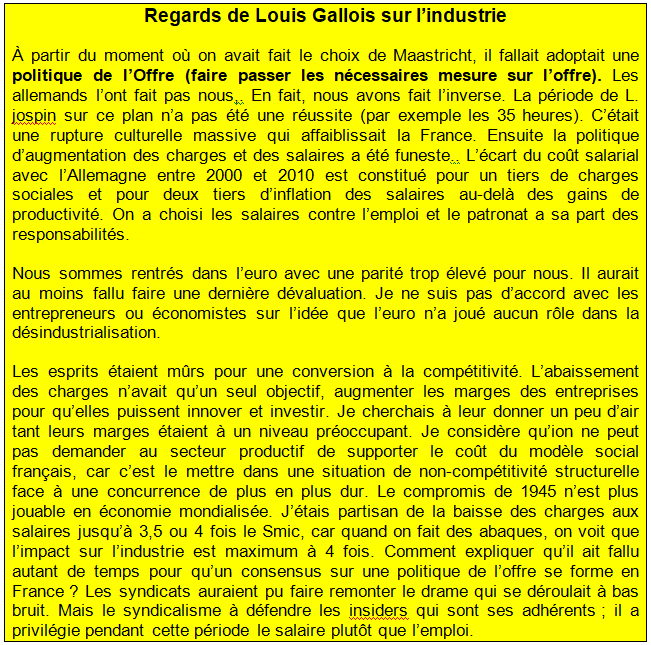 [4] Économie et statistique n°438-440 : Ampleur et principaux déterminants : un état des lieux Commentaire : Désindustrialisation ou mutation industrielle ?https://www.insee.fr/fr/statistiques/1377174?sommaire=1377175, voir aussi La désindustrialisation : quelles réalités dans le cas français ? François Bost et Dalila Messaoudi, Revue géographique de l’Est, vol.57 / 1-2 | 2017 : https://journals.openedition.org/rge/6333, voir aussi [10] Louis Gallois, Pacte pour la compétitivité de l’industrie française, rapport au Premier ministre, 5 novembre 2012 https://www.entreprises.gouv.fr/files/files/directions_services/politique-et-enjeux/simplifications/rapport-louis-gallois-competitivite.pdf