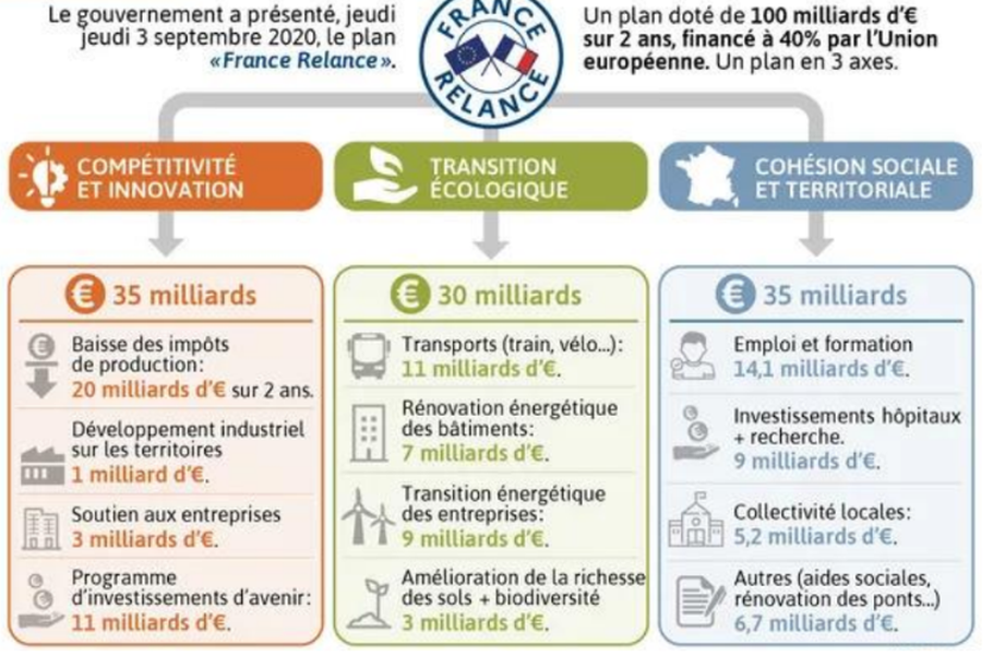 Afin de relancer rapidement l’économie et d’obtenir des résultats en matière de décarbonation, de reconquête industrielle, de renforcement des compétences et des qualifications sur l’ensemble du territoire, un plan exceptionnel de 100 milliards d’euros est déployé par le Gouvernement autour de trois volets : la transition écolologique, compétitivité et la cohésion. Ce plan est soutenu financièrement à hauteur d’environ 40 milliards par l’Union Européenne (schéma suivant).