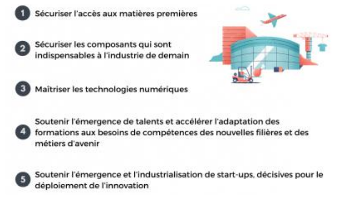 Le Plan France 2030 est une stratégie gouvernementale qui vise à préparer la France pour les défis économiques, sociaux et environnementaux à venir d’ici 2030. La ré-industrialisation est l’un des piliers de ce plan, visant à renforcer le secteur industriel français pour créer des emplois, stimuler l’innovation et réduire la dépendance aux importations. 50% des financements bénéficieront à de nouveaux secteurs, portant sur le renouvellement profond de la démographique des dirigeants et créateurs. Il acte qu’on ne pourra pas tout faire et qu’une des raisons des échecs passés est que la France s’est trop dispersée en matière d’industrie. Il déploie 8 milliards d’euros sur la décarbonation et la digitalisation de l’industrie. Il relance la filière nucléaire. Il ambitionne de construire 2 giga-usines d’hydrogène vert. Il réserve 4 milliards d’euros pour engendrer les transports du futur, avec 4 usines de batteries pour la mobilité électrique et celui de produire le premier avion bas-carbone mondial en France. Il consacre 7 Mds aux industries de la santé pour accélérer le rattrapage des retards sr le digital et sur les bio-médicaments. Ainsi ce Plan se place en partie dans la suite logique de la spécialisation de la France dans les hautes technologies (voir ci-dessus).