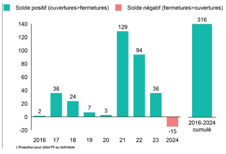 Solde net net entre le nombre de créations et de fermetures de sites industriels en France