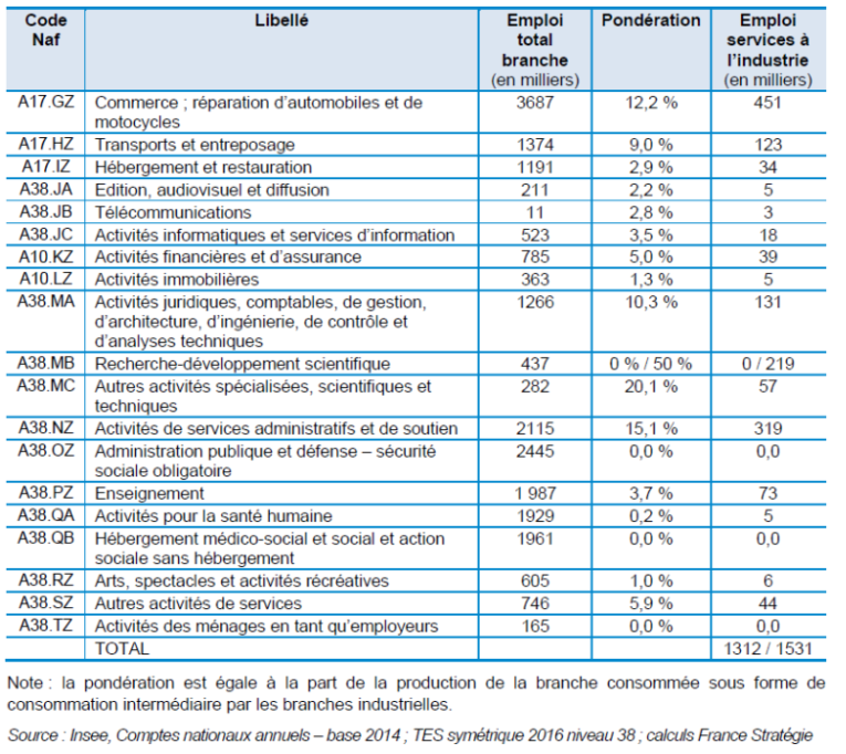 Comme déjà dit, les dépenses en R & D sont comptabilisées comme des dépenses d’investissement et non comme des dépenses de consommations intermédiaires. Compte tenu de l’importance des dépenses de R & D dans l’industrie, on peut vouloir intégrer les emplois correspondants aux services à l’industrie déjà identifiés. En 2016, les branches industrielles réalisaient 50 % de la dépense intérieure de recherche et de développement (DIRD). .On peut considérer que la moitié des emplois de la branche « recherche-développement scientifique » – soit un effectif de 218 000 – sont rattachables aux services à l’industrie.