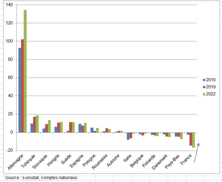Mais c’est surtout le solde des échanges extérieurs de biens qui est devenu de plus en plus déficitaire depuis 2004. Au total, et après correction des coûts d’acheminement des importations entre les frontières (correction CAF-FAB), le solde commercial des produits industriels et de l’énergie est de -94 milliards d’euros en 2021 dont -62 Md€ de produits industriels (-10 Md€ par rapport à 2020) et -32 Md€ de produits énergétiques (-17,5 Md€ par rapport à 2020). Le déficit commercial de ces deux biens se creuse de 27,5 Md€. Les données des autres pays de l’UE sont publiées ci-dessous montrant un solde commercial excédentaire.