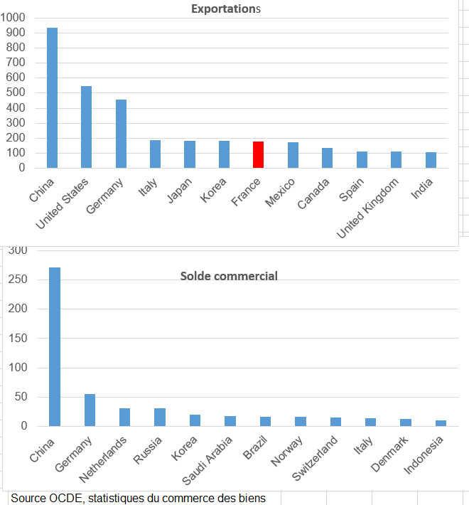 ° Statistiquement, en faisant une corrélation chiffrée on constate que pour qu’un pays ait une balance commerciale équilibrée son industrie doit représenter 17 % du PIB (hors construction), soit 21 à 22 % du PIB si la construction est incorporée dans la définition de l’industrie. Celle-ci (hors construction) ne représente plus en France que 11 % du PIB. Il ne faut donc pas s’étonner que sa balance commerciale soit en permanence déficitaire. La France importe ce qu’elle ne produit pas. À l’inverse l’Allemagne, les pays de l’est de l’Europe, la Chine produisent beaucoup de produits industriels qu’ils exportent en partie.