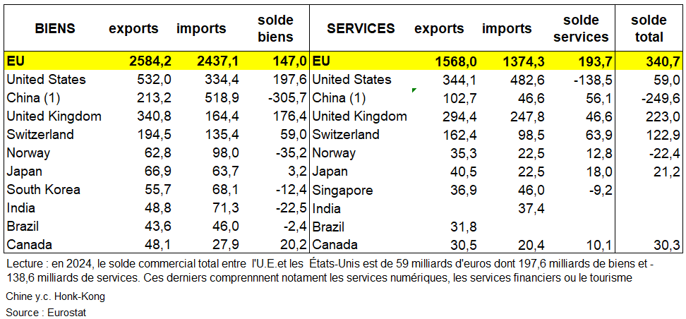 ° L’U.E. et les États-Unis entretiennent les relations bilatérales en matière de commerce et d’investissement les plus développées et les relations économiques les plus intégrées au monde. Ensemble, ils représentent près de 30 % du commerce mondial de biens et de services et 43 % du PIB mondial. En 2024, le commerce transatlantique de biens et de services a atteint 1 690 milliards d’euros. L’UE et les États-Unis sont chacun le premier partenaire commercial de l’autre dans le domaine des biens (tableau suivant). Les États-Unis sont le premier partenaire commercial de l’UE pour ses exportations et le deuxième partenaire commercial de l’UE (après la Chine) pour ses importations. Les enjeux en matière de droits de douane sont donc considérables. Or l’UE est beaucoup plus dépendante des États-Unis pour les services numériques importés que ne le sont les États-Unis pour les biens importés qui peuvent l’être à partir d’autres pays que de l’UE.