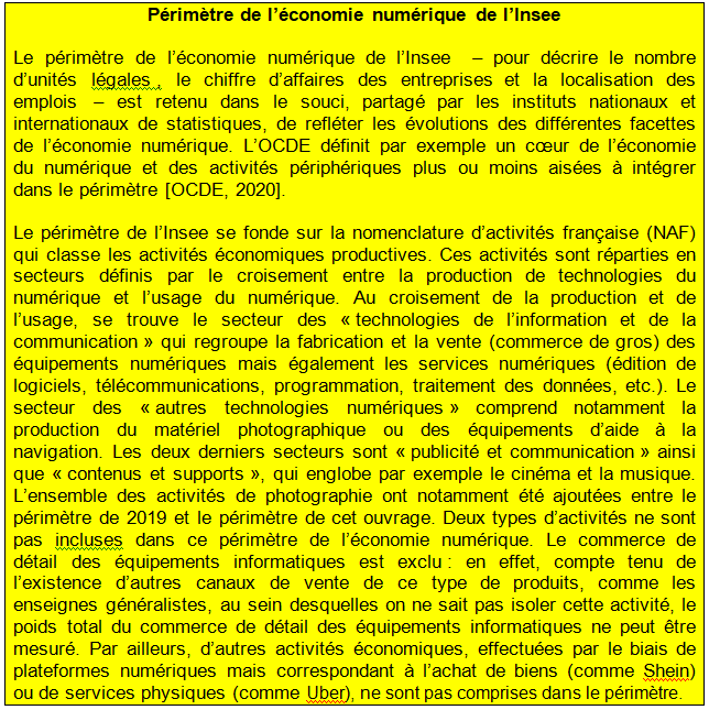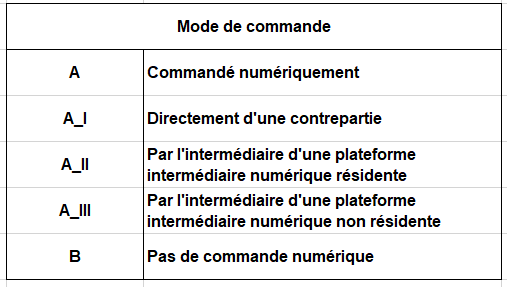 Le quatrième produit numérique concerne les frais produits par les plateformes d’intermédiation numérique : « Services d’intermédiation numérique tarifés ». Ceux-ci ne sont pas spécifiés dans les classifications de produits existantes (CPA/CPC/BPM6). Nous avons donc utilisé la population des entreprises de plateformes utilisées pour remplir l’industrie numérique, et la part des activités de plateformes dans leur emploi total ou leur chiffre d’affaires.