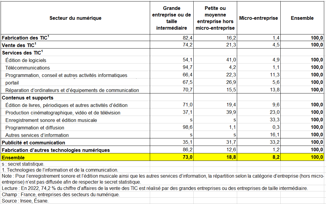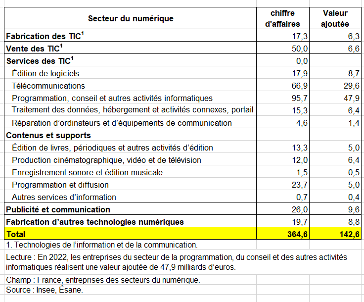 Dans la définition à 2 chiffres (nomenclature CITI 26, 61, 62, 63), cette proportion est normalement plus faible avec une légère hausse en valeur de 0,5 points en France entre 2015 et 2022 mais nettement plus forte en volumes chaînés en rapportant la valeur ajoutée des TIC à celle de l’économie (malgré la non-addivité des volumes chaînés). Le ratio passe de 3,9%en 2015 à 5,2% en 2022 en France (en base 2020). À noter que les ratios le plus élevés sont en Lettonie (plus de 7%), en Tchéquie et en Finlande (6,5%).