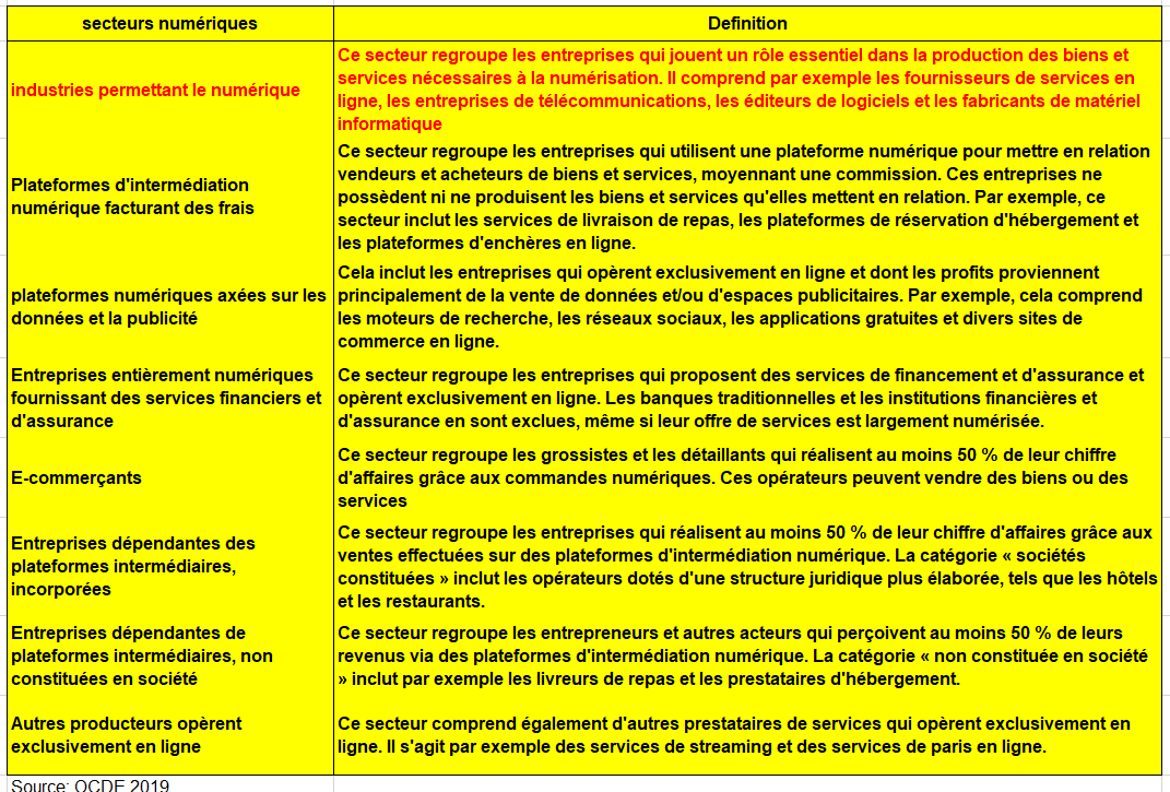 Selon les lignes directrices de l’OCDE, cette industrie « ne contiendrait que les unités qui opèrent exclusivement de manière numérique, sans interaction physique avec les consommateurs ».