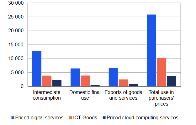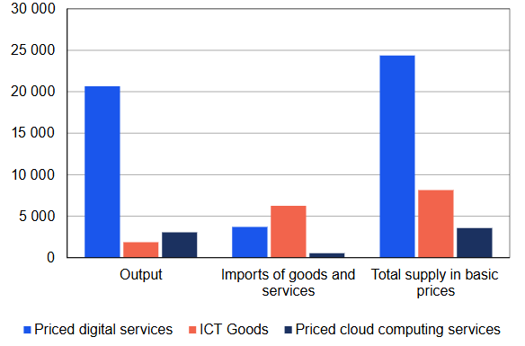 La production de services de cloud computing payants a été évaluée à 3 milliards d’euros, soit environ 0,7 % du PIB finlandais. Les importations de ces services se sont élevées à 500 millions d’euros. Il est probable que la valeur de la production nationale et des importations ait encore augmenté, compte tenu de l’essor considérable des entreprises et des ménages dans l’utilisation de ces services depuis 2018.
