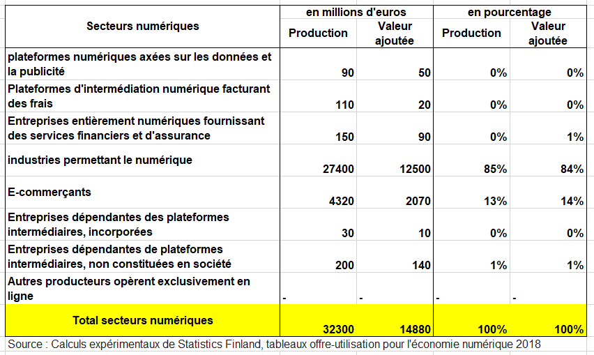 e TRE numérique finlandais est établi selon les normes internationales de l’OCDE (2019). De plus, leurs calculs reposent sur les concepts et définitions de la comptabilité nationale, ce qui rend les données plus comparables. De nouvelles branches d’activité décrivent ainsi différents domaines de la numérisation. Les TRE pour l’économie numérique comprennent sept nouvelles catégories de branches : les industries facilitant la numérisation ; les plateformes numériques d’intermédiation payantes ; les plateformes numériques axées sur les données et la publicité ; les entreprises dépendantes des plateformes d’intermédiation ; les détaillants en ligne ; les entreprises 100 % numériques fournissant des services financiers et d’assurance ; et les autres producteurs opérant exclusivement en ligne. (Tableau suivant) Ces catégories d’industries permettent de décrire de manière exhaustive les principales activités économiques liées à la numérisation et d’illustrer les différentes connexions de l’économie numérique.