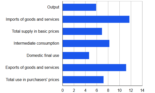 Selon nos estimations, en 2018, environ 14 % de la production économique finlandaise était constituée de commandes numériques. Cette estimation est probablement sous-estimée, car il nous a été impossible de distinguer les commandes de services numériques et non numériques, notamment pour les produits de l’administration publique. Les calculs ont été effectués au niveau des produits et des secteurs d’activité.