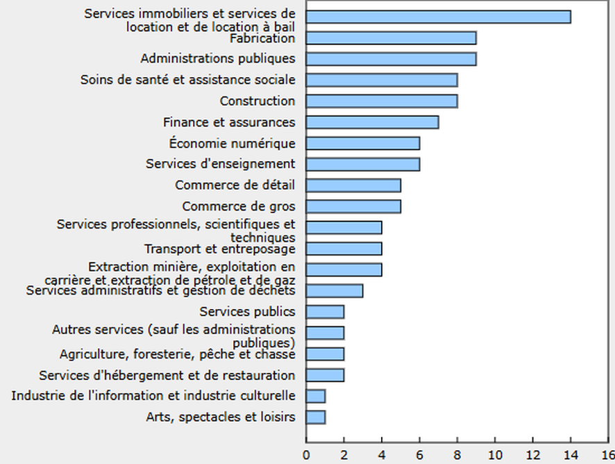 En 2017 comme en 2022, le secteur de l’information est celui qui contribue le plus à la valeur ajoutée de l’économie numérique, , passant de 717 milliards de dollars en 2017 à 1 024 milliards de dollars en 2022, soit un taux de croissance annuel moyen de 7,5 %. Les services professionnels et les services aux entreprises ont été le deuxième secteur contribuant le plus à la valeur ajoutée de l’économie numérique en 2017 et en 2022, suivis par le commerce de gros, l’industrie manufacturière et le commerce de détail. Plus de 80 % de la production brute est ainsi produit par 3 branches :- l’information (43,2 %), – Commerce de gros (21,4 %), – les services professionnels et commerciaux et les services aux entreprises (16,6 %) (second graphique suivant).