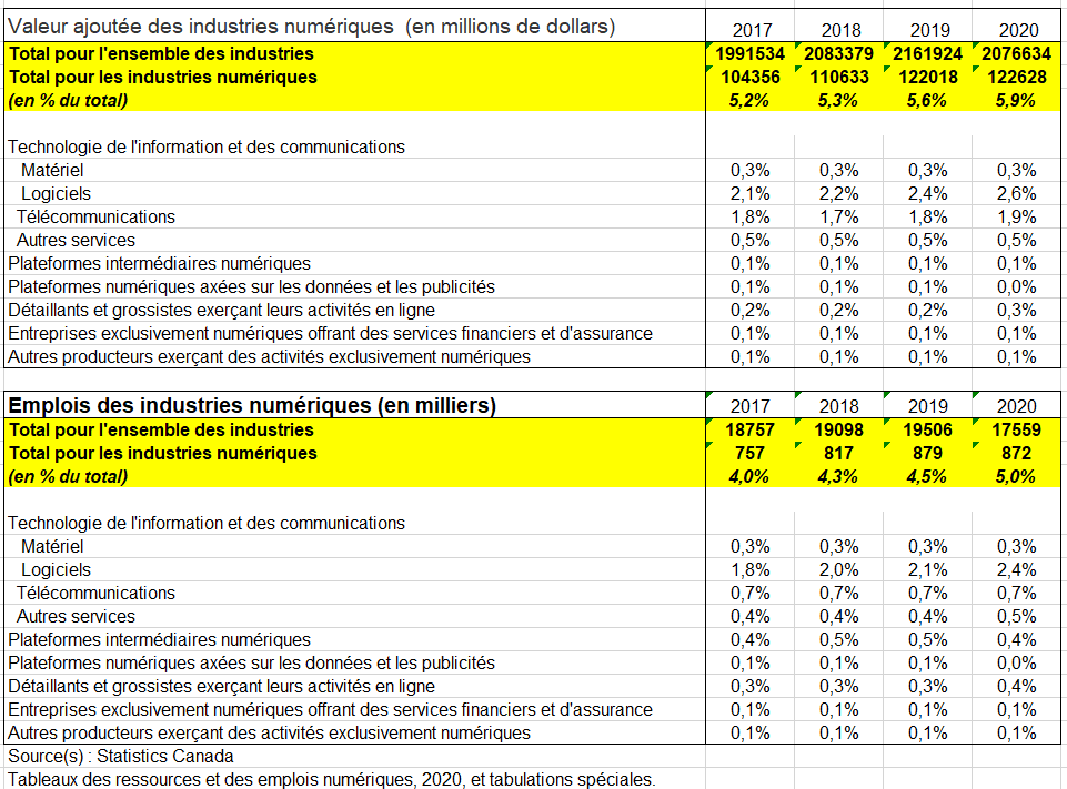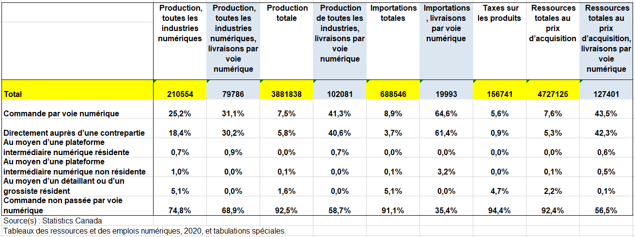 Les données sur le rôle de l’économie numérique sont accessibles dans les TRE du secteur numérique canadien https://www150.statcan.gc.ca/n1/daily-quotidien/230725/dq230725a-fra.htm. Ces tableaux représentent un outil important pour comprendre les répercussions de la numérisation sur l’activité économique. Les TRE du secteur numérique canadien présentent des renseignements détaillés sur l’infrastructure axée sur le numérique ainsi que sur l’approvisionnement et l’utilisation de produits numériques et de produits et services commandés et livrés par voie numérique. Les données sont fondées sur le cadre de mesure de l’économie numérique produit par l’Organisation de coopération et de développement économiques.