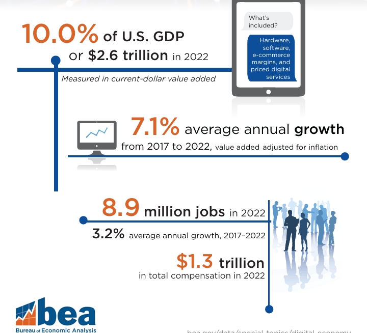En 2022, l’économie numérique des États-Unis a atteint 2,6 trillions de dollars (second tableau suivant).. La valeur ajoutée, ajustée pour l’inflation, . Les services numériques incluant le matériel, les logiciels, les marges du commerce électronique et les services numériques, représentent 10 % de la valeur ajoutée totale de l’économie, avec une croissance de 7,1 % entre 2017 et 2022. L’économie numérique a contribué à la création de millions d’emplois, soulignant son importance croissante dans le paysage économique américain.