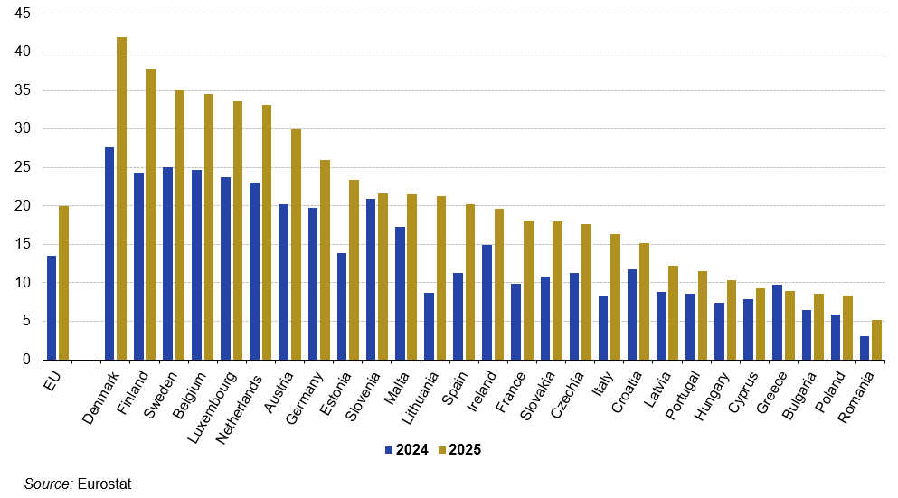 En 2020, 22 % de la production de l’économie a été commandée numériquement (154 milliards d’euros). Cela comprenait 21 milliards d’euros (3 % du total) de biens et 133 milliards d’euros (19 % du total) de services.