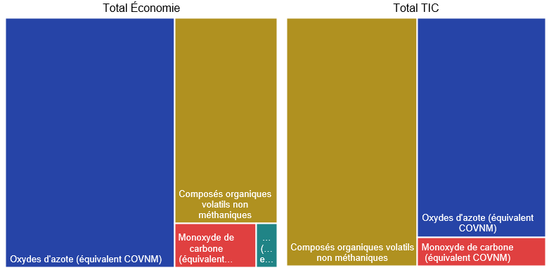 Les industries numériques ont représenté 5,4 % (211 milliards de dollars) de la production brute totale en 2020. Les produits commandés en ligne ont représenté 7,6 % (361 milliards de dollars) dees ressources totales et les services offerts par voie numérique, 2,7 % (127 milliards de dollars).