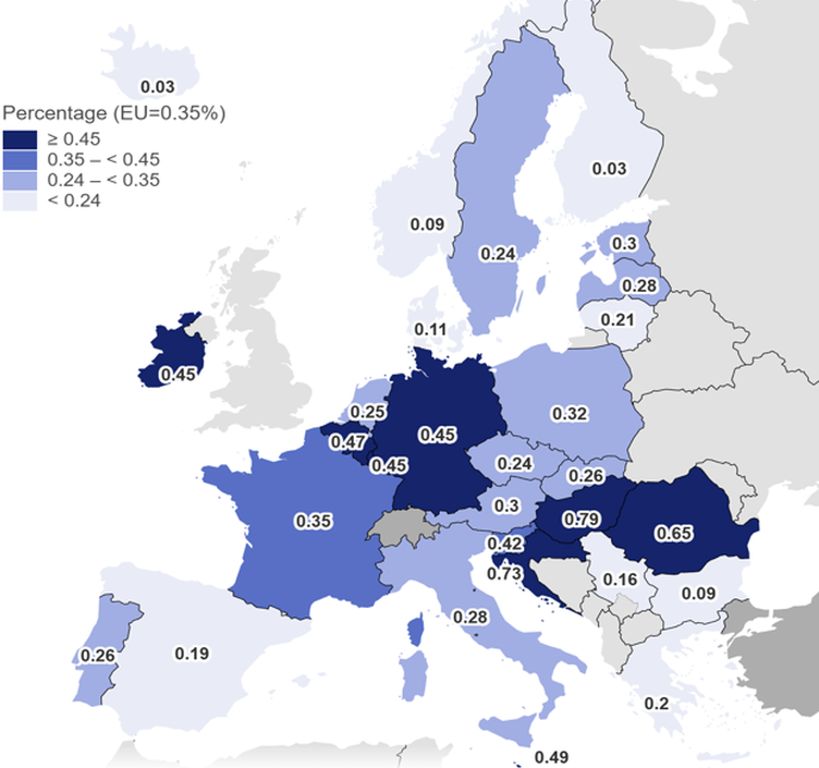 Tout d’abord, tous les services figurant dans les lignes directrices de l’OCDE qui coïncident individuellement avec une classe de produits dans les TRE néerlandais sont transférés dans leur intégralité aux services numériques tarifés, ce qui signifie que la production nationale est également transférée. Pour les services qui ne constituent qu’une partie d’un code de produit dans les TRE néerlandais, les méthodes employées pour déterminer la fraction à transférer diffèrent en fonction de la disponibilité des données. Dans certains cas, l’enquête structurelle sur les entreprises contenait des informations supplémentaires sur les services fournis, ce qui nous a permis de déterminer la proportion d’un code de produit constituée de services numériques, à l’exception des services d’informatique en nuage et des services d’intermédiation numérique. Les services d’installation à considérer comme des services numériques pourraient être distingués des autres services de réparation/maintenance/installation grâce aux données PRODCOM. Enfin, pour les services industriels, les fractions de services numériques des codes de produits sous-jacents au niveau à deux chiffres sont prises et pondérées pour obtenir une fraction pondérée unique.