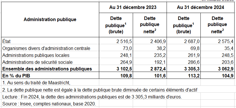 b) La dette au sens de Maastricht s’établit à 113,2 % du PIB fin 2024