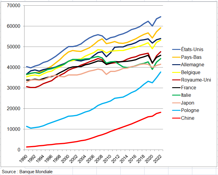 Le premier graphique concerne la croissance du PIBen volume dans quelques pays. La croissance est de +2% par an aux États-Unis entre 2000 et 2022 contre +1,2% dans la zone Euro comme en France. Elle est de +1,1% en Allemagne et +0,3% en Italie. Elle est très forte en Pologne (+3,8%) mais aussi en Australie (+2,8%).