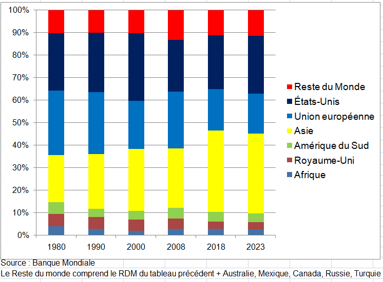 L’économie américaine a aussi bénéficié de la crise énergétique qui a frappé l’Europe suite à la guerre en Ukraine. Le malheur de l’Europe, privée du gaz russe, a dopé les exportations américaines de gaz naturel liquéfié à partir de 2022, donnant un coup de fouet durable à l’industrie des hydrocarbures. Avec cette guerre, la dépendance de l’Union aux hydrocarbures russes a fortement ralenti la foulée européenne en raison des contraintes d’approvisionnement apparues lorsqu’il a fallu réduire la dépendance à Moscou, et de la hausse des prix qui en a résulté – dont les conséquences ont atteint à la fois les ménages et les entreprises. En 2019, les États-Unis sont devenus exportateurs nets d’énergie. En 2021, l’UE dépendait, pour 55,5 % de sa consommation d’énergie, de ses importations (-voir page Comptes de l’énergie). La dépendance énergétique de l’Europe vis-à-vis du reste du monde est donc forte. Plus particulièrement à l’égard des États-Unis, du Moyen-Orient en ce qui concerne le gaz et le pétrole.