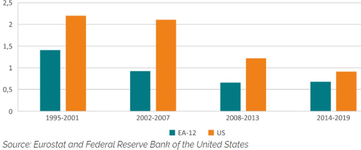 Aux États-Unis, les parts relatives des facteurs de croissance économique sont assez similaires, mais ce qui ressort, c’est que la contribution de l’approfondissement du capital et de la croissance de la PTF est nettement plus importante que dans la zone euro. Alors que le taux de PTF américain a baissé par rapport aux niveaux élevés des années 1990 – niveaux qui ont été poussés par le changement technologique à travers la révolution des technologies de l’information et de la communication (TIC) après une forte augmentation des dépenses d’investissement dans les TIC – la croissance de la PTF reste beaucoup plus élevée que dans le groupe de la zone euro.