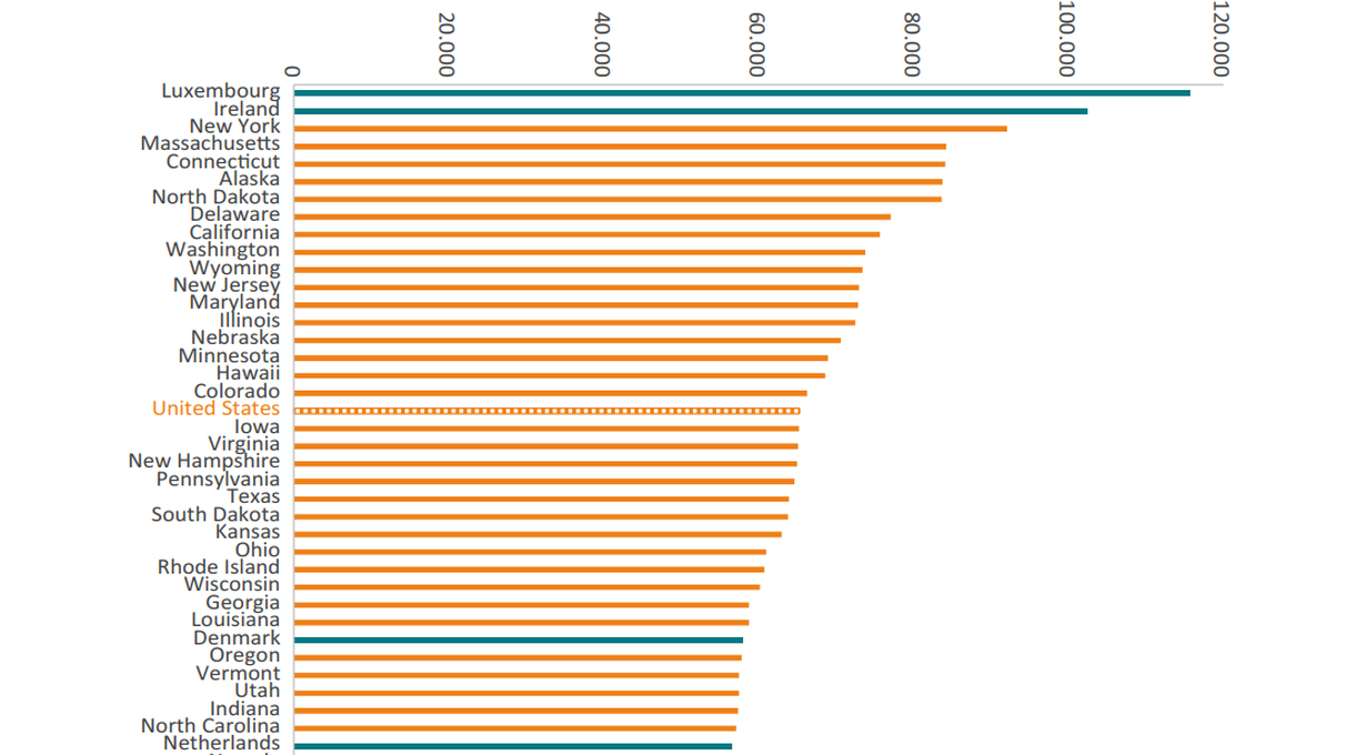 Si on compare le PIB par habitant des États américains et des États membres de l’UE en dollars américains, il apparaît que les États américains sont beaucoup plus représentés dans la partie supérieure du classement que les États membres de l’UE. Cela se traduit par un écart considérable entre les moyennes de l’UE et des États-Unis, la moyenne américaine se situant à la 19e place et la moyenne de l’UE à la 60e place seulement. En bas, on trouve les États membres de l’UE du Centre, de l’Est et de la Baltique, qui ont commencé les années 2000 avec un revenu par personne relativement faible, ainsi que les États membres du Sud de l’UE comme la Grèce, le Portugal, l’Espagne et l’Italie