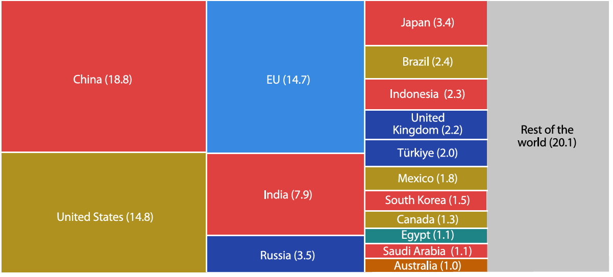 ° On peut ainsi calculer les parts du PIB des différents pays dans le PIB mondial par pays en valeur ou en parités de pouvoir d’achat. Le Programme de comparaison internationale (PCI) est un partenariat statistique mondial qui produit des parités de pouvoir d’achat (PPA) et des niveaux de prix comparés pour les pays participants afin de comparer au niveau international la taille du produit intérieur brut (PIB) et de ses principales composantes en tenant compte des différences de niveaux de prix. En 2021, la Chine, les États-Unis et l’Inde continuaient d’avoir le PIB le plus élevé au monde, représentant respectivement 19 %, 15.5 % et 7.2 % du PIB mondial par pays, exprimé en PPA (graphique suivant).