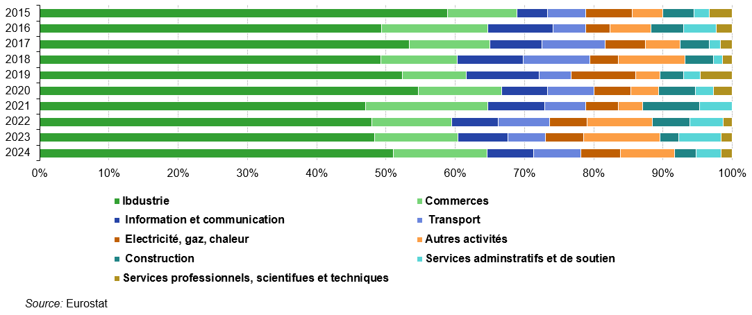 Dans les tableaux d’Eurostat, les ETI et les GE définissent les grandes entreprises. On considére ici que les entreprises de moins de 49 personnes représentent les petites entreprises.