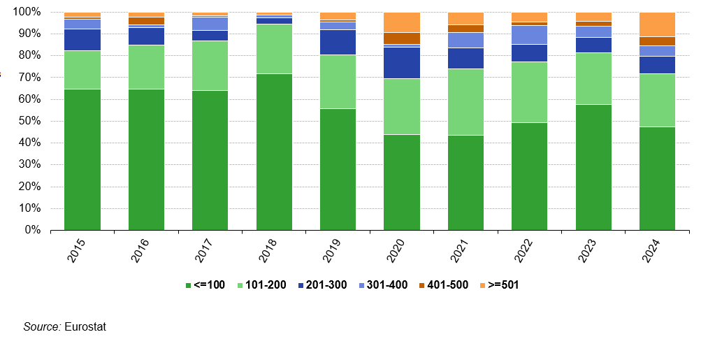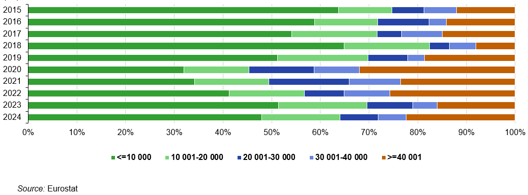 En ce qui concerne la valeur ajoutée, 35 % de la valeur ajoutée provenaient de petites entreprises, 17 % de moyennes et 48 % de grandes entreprises. Ces parts varient d’un État membre à l’autre. En 2019, la plus grande part de la valeur ajoutée générée par les petites entreprises a été constatée à Malte (56 %) et à Chypre (53 %), tandis que les moyennes entreprises ont généré la plus grande part de la valeur ajoutée en Estonie (26 %), en Lettonie et en Lituanie (tous deux 25 %). Les proportions les plus élevées pour les grandes entreprises ont été observées en Irlande (64 %), en France (57 %) et en Allemagne (53 %).