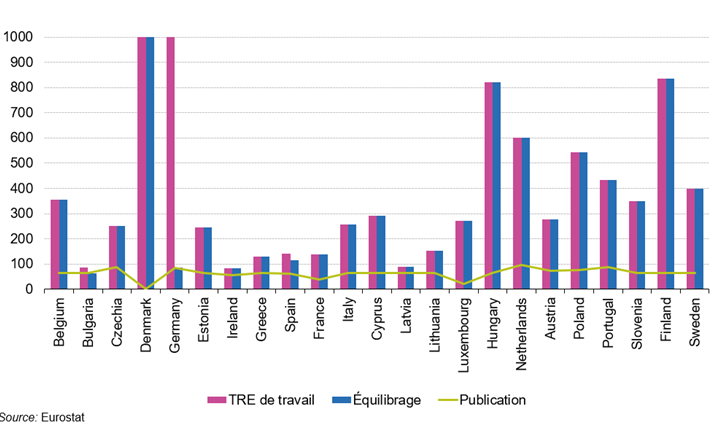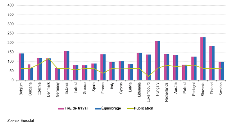 Selon Eurostat, il est intéressant de savoir quelles ressources les pays consacrent à l’élaboration des TRE et combien de temps elle prend? Mais il s’avère difficile de répondre à ces questions. Le délai entre le début de la compilation des TRE et le début de l’équilibrage varie d’un mois en Tchéquie et en Grèce à 18 mois dans d’autres pays. Dans 8 pays, il faut entre 1 et 3 mois pour élaborer des tableaux, tandis qu’environ 10 pays ont besoin de 4 à 6 mois pour terminer le processus de compilation. En outre, le temps nécessaire pour effectuer l’équilibrage varie considérablement d’un pays à l’autre, allant de 1 semaine au Luxembourg et en Italie à 4 mois en Hongrie, 5 à Chypre et 6 mois au Danemark. Cette information n’est pas vraiment comparable d’un pays à l’autre, car elle dépend : (I) du système de production dans chaque pays (par exemple, l’intégration entre la production des comptes nationaux réguliers et les TRE); et ii) de l’affectation du personnel à l’élaboration de ces tableaux. La France serait le seul pays à trouver des personnes travaillant à temps plein sur les TRE (1 pour les tableaux trimestriels et 1 pour les tableaux annuels). Dans tous les autres pays, le personnel participant au processus de compilation a également d’autres tâches au cours de l’année.